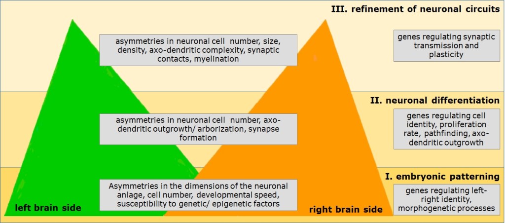 In this review, Martina develops an overarching model to explain the ontogeny of neuronal asymmetries combining data from human and animal research. It suggests a multi-level model for asymmetry formation whereby the relative impact of genetic and nongenetic factors varies between different developmental phases and neuronal structures. The basic lateralized organization of a brain is already established through genetically controlled embryonic events. During ongoing development, hemispheric specialization increases for specific functions and subsystems interact to shape the final functional organization of a brain. In particular, these developmental steps are influenced by environmental experiences, which regulate the fine-tuning of neural networks via processes that are referred to as ontogenetic plasticity.